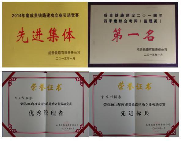 公司成貴監(jiān)理項目部在業(yè)主(成貴鐵路有限責(zé)任公司)組織的2014年度建功立業(yè)勞動競賽評比活動中獲得先進(jìn)集體榮譽,李文俊、李宗付同志喜獲優(yōu)秀管理者、先進(jìn)標(biāo)兵稱號。 在業(yè)主四季度平推檢查綜合評比過程中,成貴監(jiān)理項目部暨二季度平推檢查后,再次榮獲第一名佳績,并為企業(yè)樹立了良好形象。
