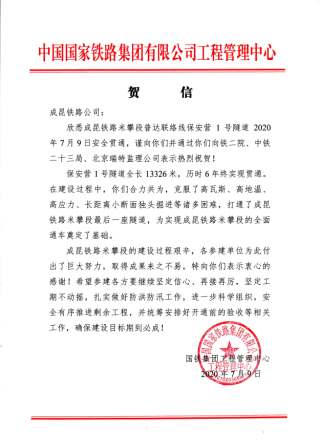 國鐵集團工程管理中心專門發(fā)來賀信,祝賀我公司負(fù)責(zé)監(jiān)理的成昆鐵路保安營1號隧道(米攀段普達(dá)聯(lián)絡(luò)線)于2020年7月9日安全貫通,謹(jǐn)向建設(shè)單位成都局成昆鐵路公司并轉(zhuǎn)向參建北京瑞特監(jiān)理公司和設(shè)計施工單位表示熱烈祝賀!